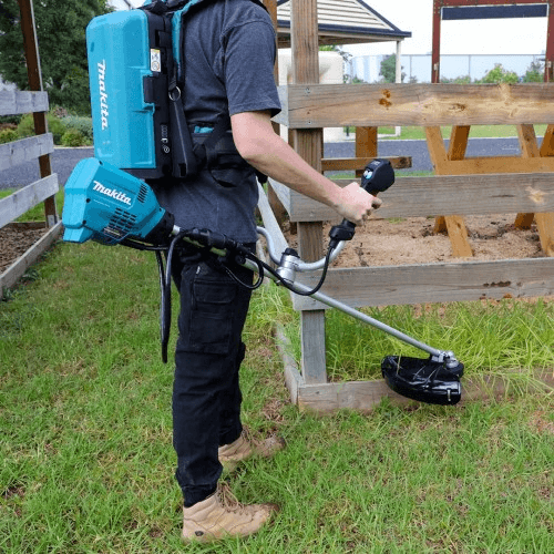 36 V (18 V x 2). Commande de vitesse à 3 niveaux avec interrupteur de marche arrière. Largeur de coupe 430 mm. Alimentée par support dorsal. Produit vendu seul. Poids 5,2 kg.
