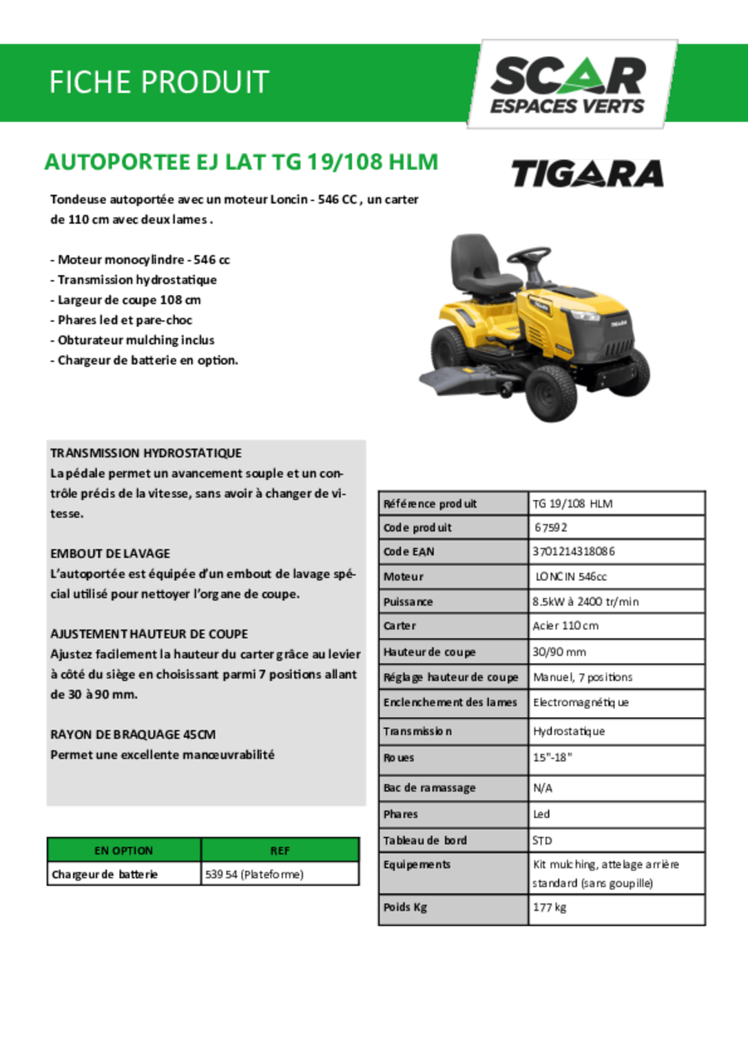 | Largeur de coupe | 108 cm |