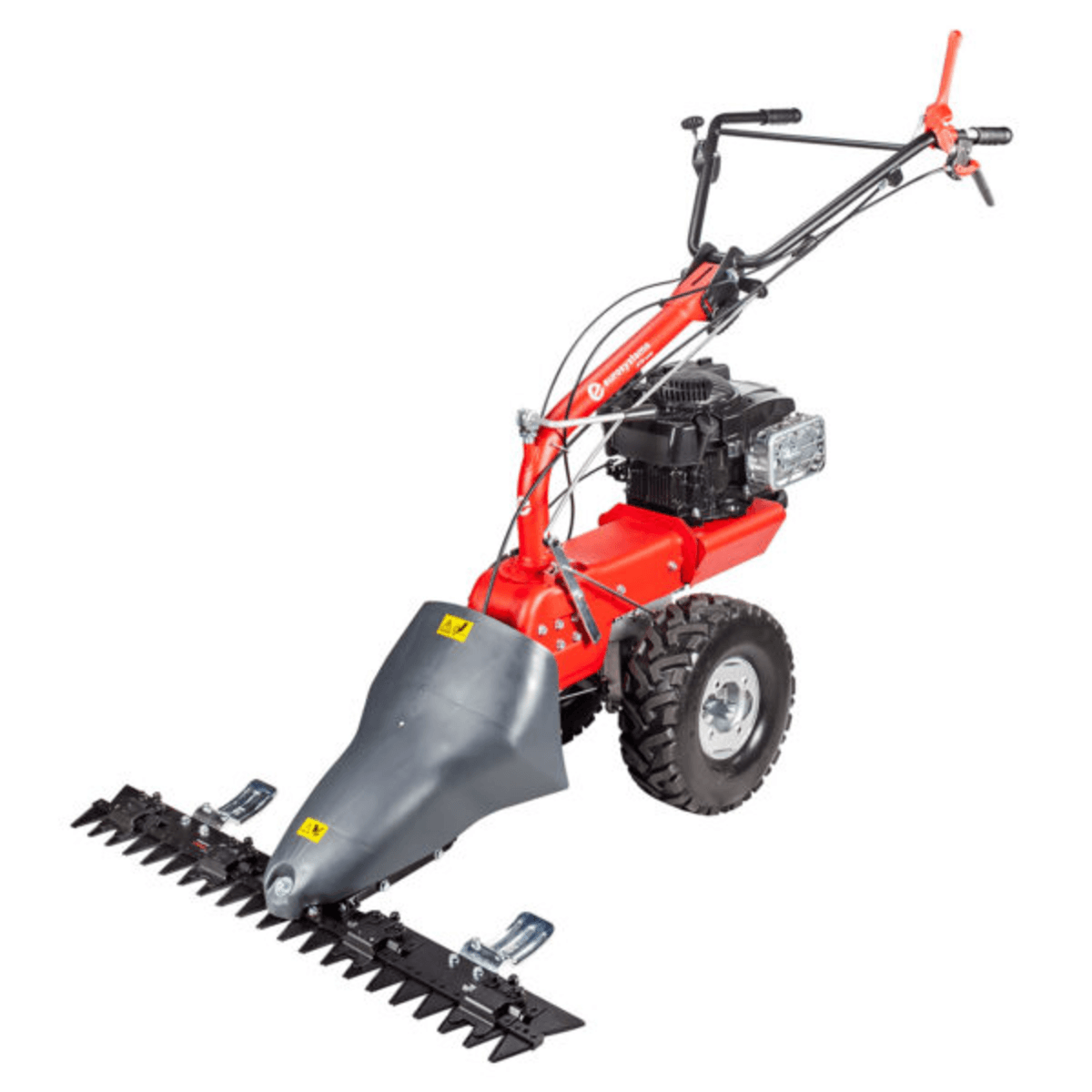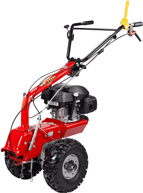 Moteur LONCIN OHV. 224 cc. 4,35 kW. Démarrage manuel. Transmission à engrenages et vis sans fin dans un bain d'huile et courroie. 3 vitesses avant (2 avec fraise), 2 vitesses arrière (1 avec fraise). Guidon déportable, repliable et réglable en hauteur. 2 roues 13x6x6.