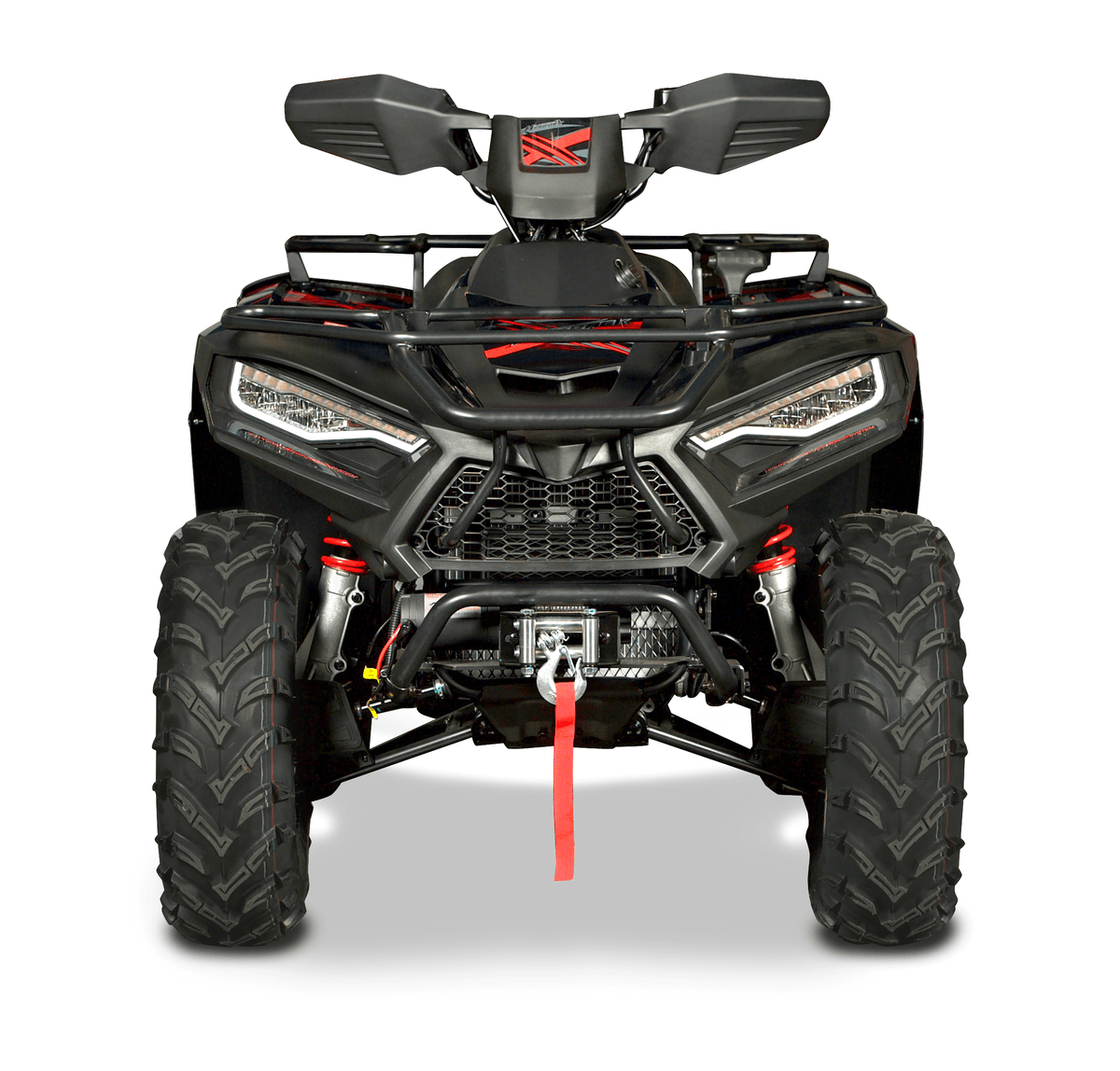 Transmission : variateur automatique, vitesse longue, vitesse courte, marche arrière. Mode 4x4 à la demande par commande électrique, différentiel avant avec blocage à glissement limité Finale.