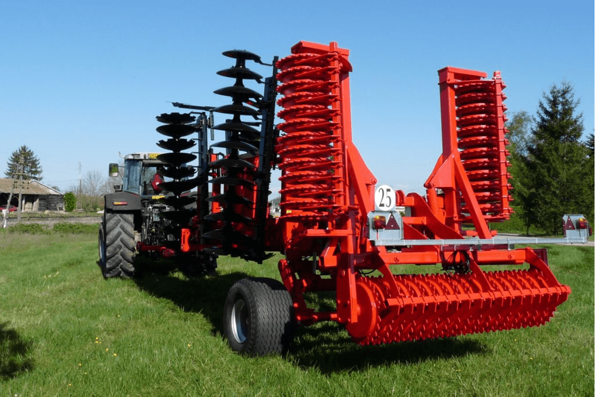 Disques 660 mm ou 710 mm, crantés avant, lissés arrière ou alternés + 2 oustridgers. Chariot 2 roues sur essieu 90 mm, 6 axes