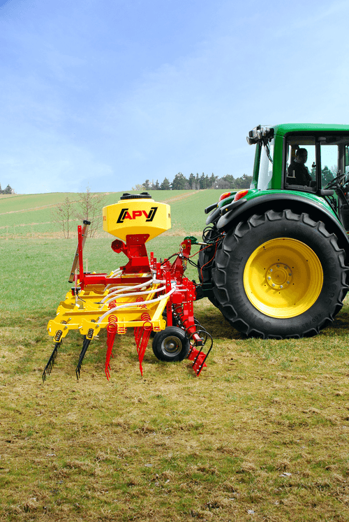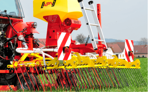 4 - Herse de prairie WS avec 2 rangées de dents de 12 mm ou 10 mm, vérin hydraulique pour réglage profondeur, montage simple à l’avant y compris 2 roues de jauge. Faible poids pour une adaptation parfaite au petits tracteurs. Montage possible d’un semoir pneumatique ou d’un doseur multipe.