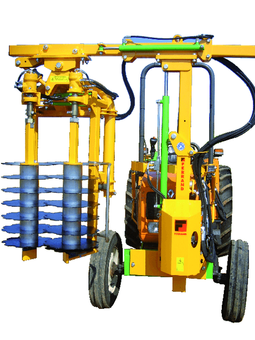 La pré-tailleuse Ferrand a pour équipement standard : mât polyvalent avec potence, commande électrique de la cabine, distributeur empilable évolutif, support tracteur et tirant, démontage rapide des disques, déport hydraulique.