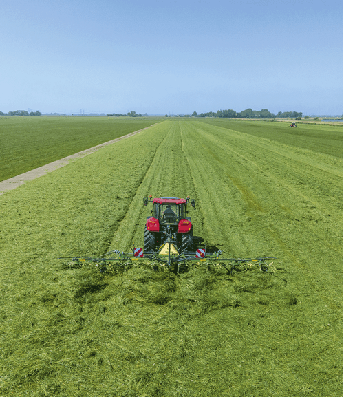 Une large gamme de faneuses rotatives VENDRO qui se compose de faneuses portées, semi-portées ou trainées de 4 à 10 toupies et de 4.70 m à 11.20 m de largeur de travail.
