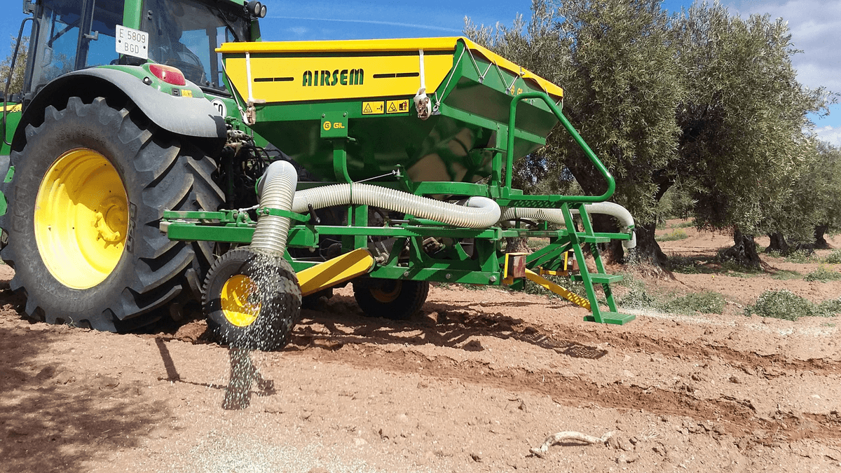 Épandeur d'engrais pneumatique de précision pour oliviers, amandiers et autres arbres fruitiers avec une capacité trémie 2 200 L. Technologie SONAR ou possibilité d’utilisation en mode manuel. Adaptation à différents cadres de plantation. Bras extensible jusqu'à 10 m. 1 distributeur indépendant de chaque côté. Modification de la largeur de travail par ouverture hydraulique. Peut fertiliser un granulaire à partir de 1mm.