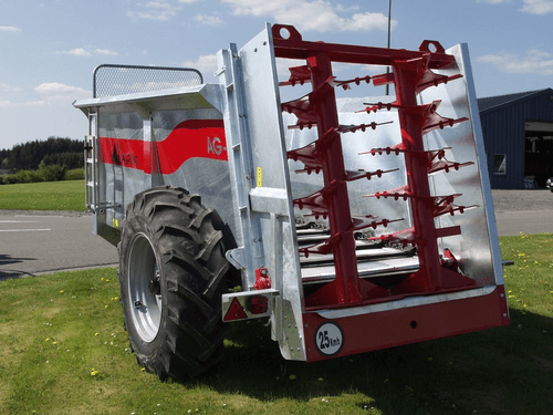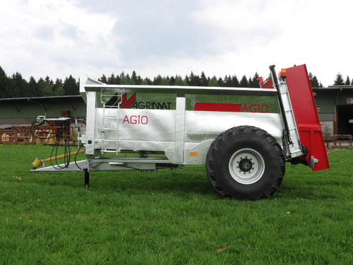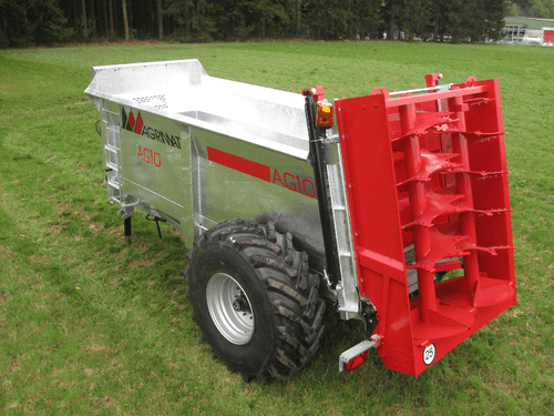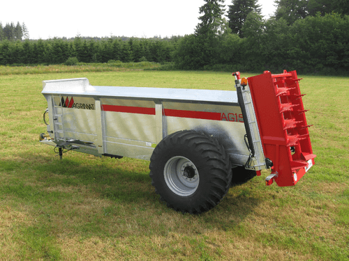 Epandeurs de fumier monocoque série AG surbaissé à 2 vis verticales. Caisse à côtés évasés de forte épaisseur (4 mm et 8 mm au passage des chaînes), hérissons x 1900 mm : 2 vis sans fin verticales, épaisseur 10 mm, inclinées avec couteaux HARDOX boulonnés réversibles ø vis 875 mm (sauf ag8), frein pneumatique, avance du tapis hydraulique avec régulateur de débit sur support (double effet tracteur), entraînement des boîtiers par transmission 540 trs et 1000 trs/min (cardan), cric hydraulique, axe arrière ø 55 mm, éclairage conforme au code de la route, largeur d’épandage : jusqu’à 9 m (selon produit), échelons d’accès extérieur, flèche ressort – anneau fixe, tapis 2 chaînes marines : 14 mm pour AG8 – AG10 – AG12 16 mm pour AG15, transmission avec sécurité à boulon et roues libres. Grand choix d’options pour chaque utilisateur.
