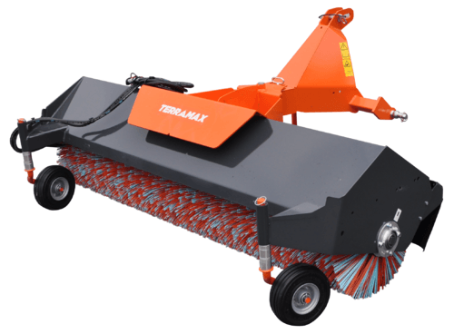 Balai mixte Polyester/Polypropylène Ø 550 mm, largeur 2,10 m. Entraînement hydraulique. Orientation et déport mécanique 8 positions (D et G). 2 roues de terrage 400x80 pivotantes à 360° et réglables en hauteur. Béquille de dépose. Moteur hydraulique protégé. Attelage trois point arrière.