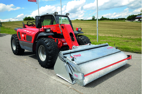 Rouleau brosse 2,40 m, en plastique, godet 0,80 m³. Attelage Euro. Galvanisé. Supplément pour montage chargeur ou télescopique. Autre rouleau brosse disponible.