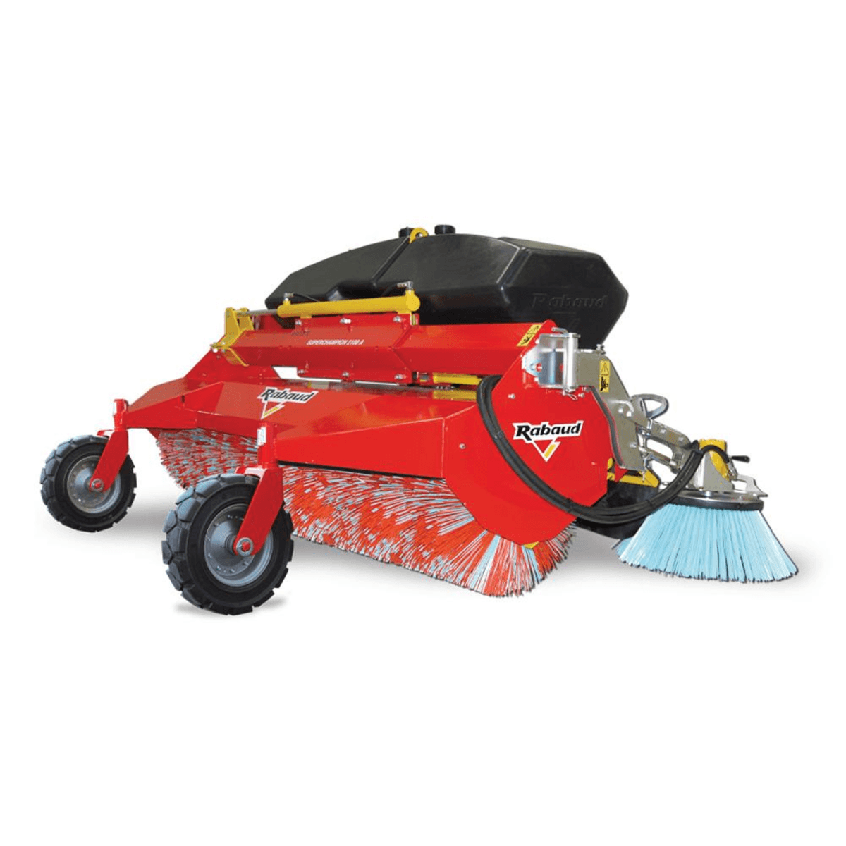 Balai largeur 2,40m, Ø 600mm. Déport droite/gauche 450 mm. Orientation +/- 30°. 2 roues pleines et increvables 400mm, pivotantes 360°, avec graisseur. Entraînement pompe tracteur. Options disponibles : déport et orientation hydraulique, balai latéral, arrosage...