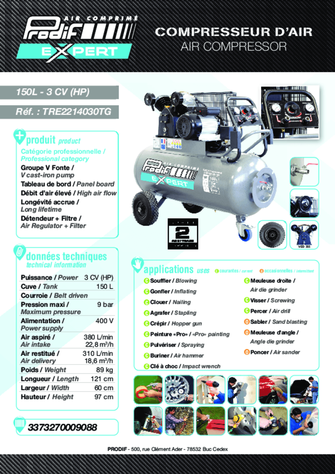 Triphasé. Moteur bicylindre en V, 3 CV, air restitué 310 L/min. Grosses roues pleines. Tuyau 20 m avec poignée.