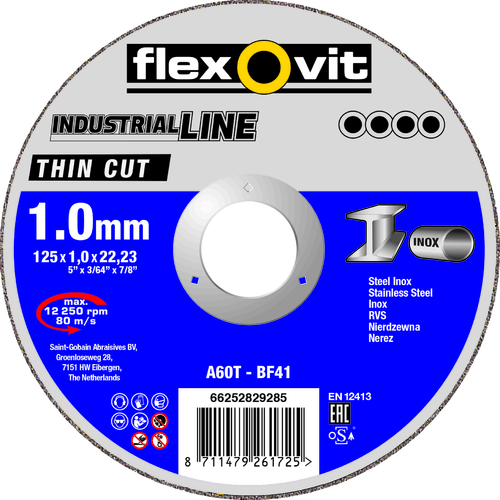 Meule de tronçonnage. Moyeu plat. Acier/acier inoxydable. Formule sans soufre, ni fer, ni chlore. Applications universelles. Dimensions : 230x2,5x22,2 mm. Spécification : A 30 S-BF41.