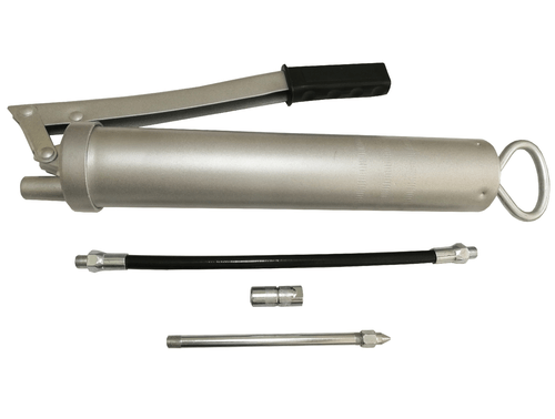 Flexible en polyamide, long. 300 mm, agrafe 4 mors. Tête de pompe en aluminium. Débit : 0,8 cm³/coup. Pression de service 350 Bar, haute pression jusquà 600 Bar. Pour cartouche 400 g et graisse en vrac.