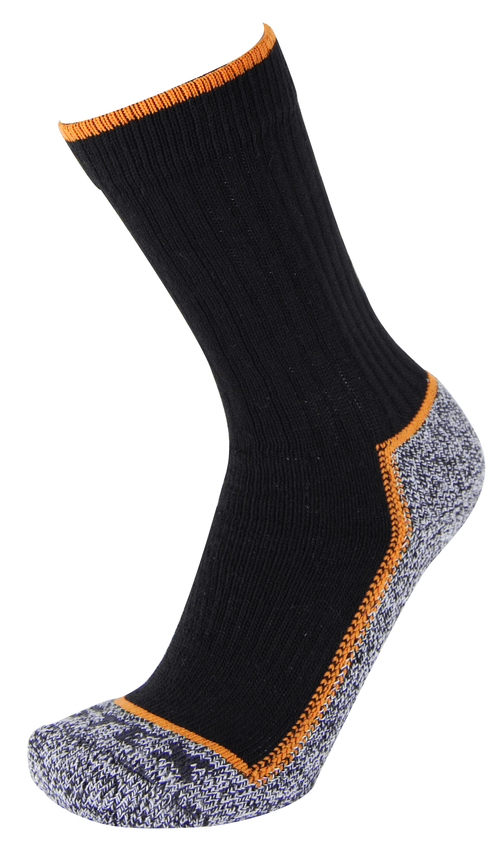 Chaussettes adaptées aux chaussures de sécurité. 58 % coton, 22 % polyester Coolmax, 16 % polyamide, 4 % polyamide Cordura. Pointures du 39/42 à 43/46.