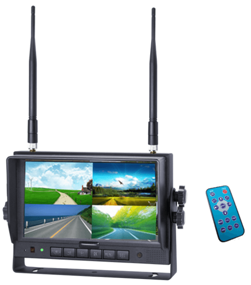 Affichage simultané jusqu’à 4 caméras. Mise en marche automatique ou manuelle. 12-24 V. 800 x 480 pixels. Livré avec télécommande.