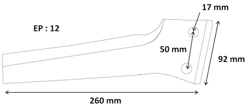 Longueur : 260 mm. Largeur : 92 mm. Epaisseur : 12 mm. Entre-axe : 50 mm. Diamètre trou : 17 mm. Pour Mekfarmer : 80, 100. Gauche.