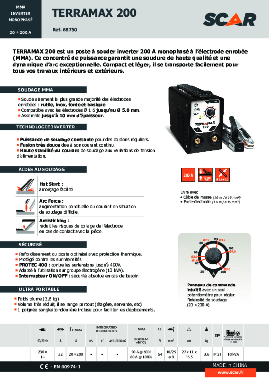 Livré avec accessoires : câble de masse 16 mm² de 1,6 m, porte-électrode 16 mm² de 1,6 m.
